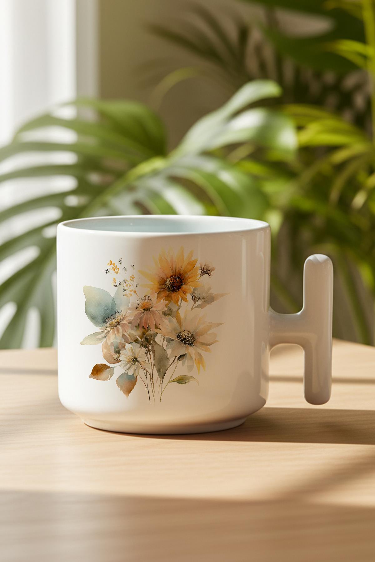 Ayçiçekleri Sonbahar Teması No:2 Baskılı Hediyelik T Kulplu Latte Fincanı Kupa Bardak