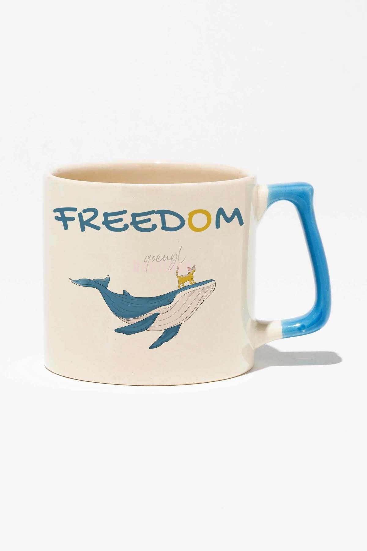 Balina ve Kedi Freedom Yazılı Eğlenceli Baskılı Mavi Kulplu Modern Seramik Kupa