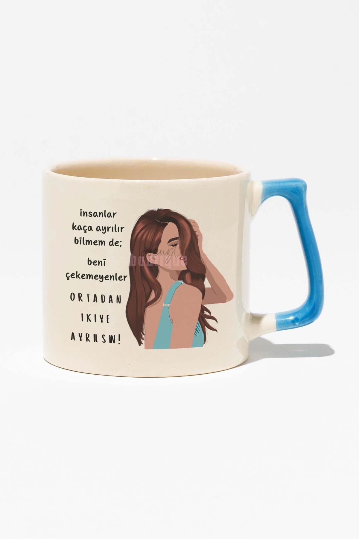 Beni Çekemeyenler Ortadan İkiye Ayrılsınlar Hediyelik Baskılı Mavi Kulplu Modern Seramik Kupa
