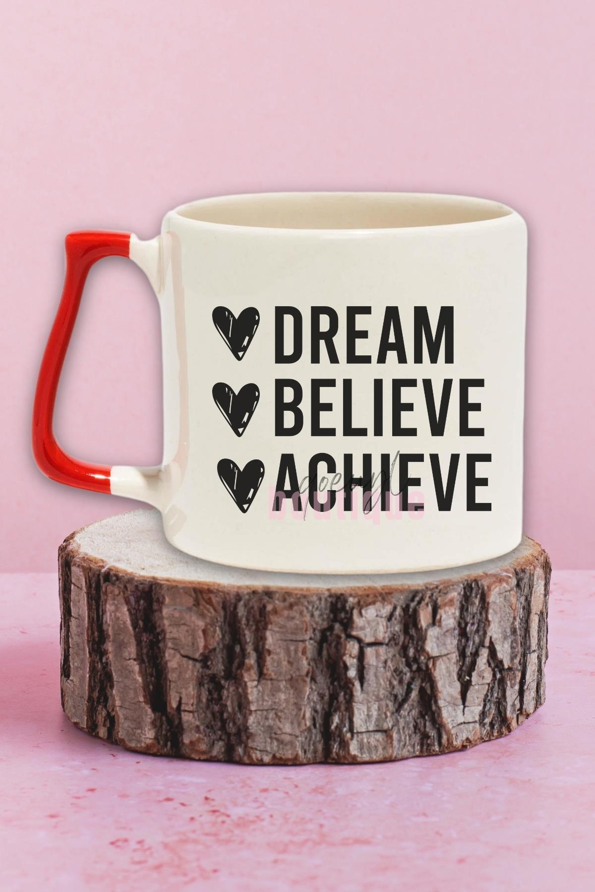 Dream, Believe, Achieve Baskılı Motivasyon Başarı Sloganı Hediyelik Kulplu Kupa Bardak