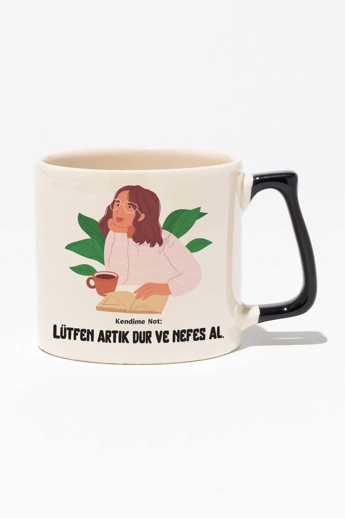 Dur ve Nefes Al Eğlenceli Hediyelik Beyaz Baskılı Siyah Kulplu Modern Seramik Kupa