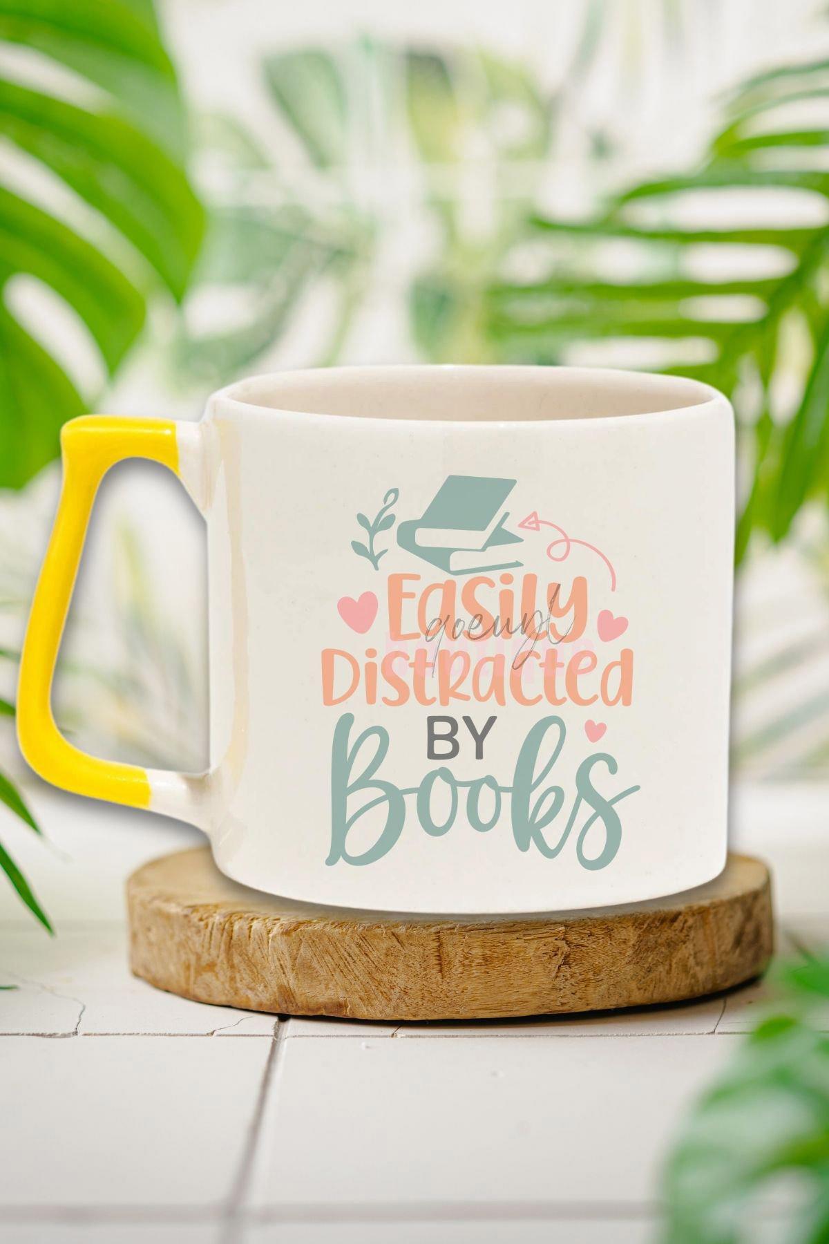 Easily Distracted By Books Yazılı Kitap Kurdu Esprisi Hediyelik Sarı Kulplu Kupa Bardak