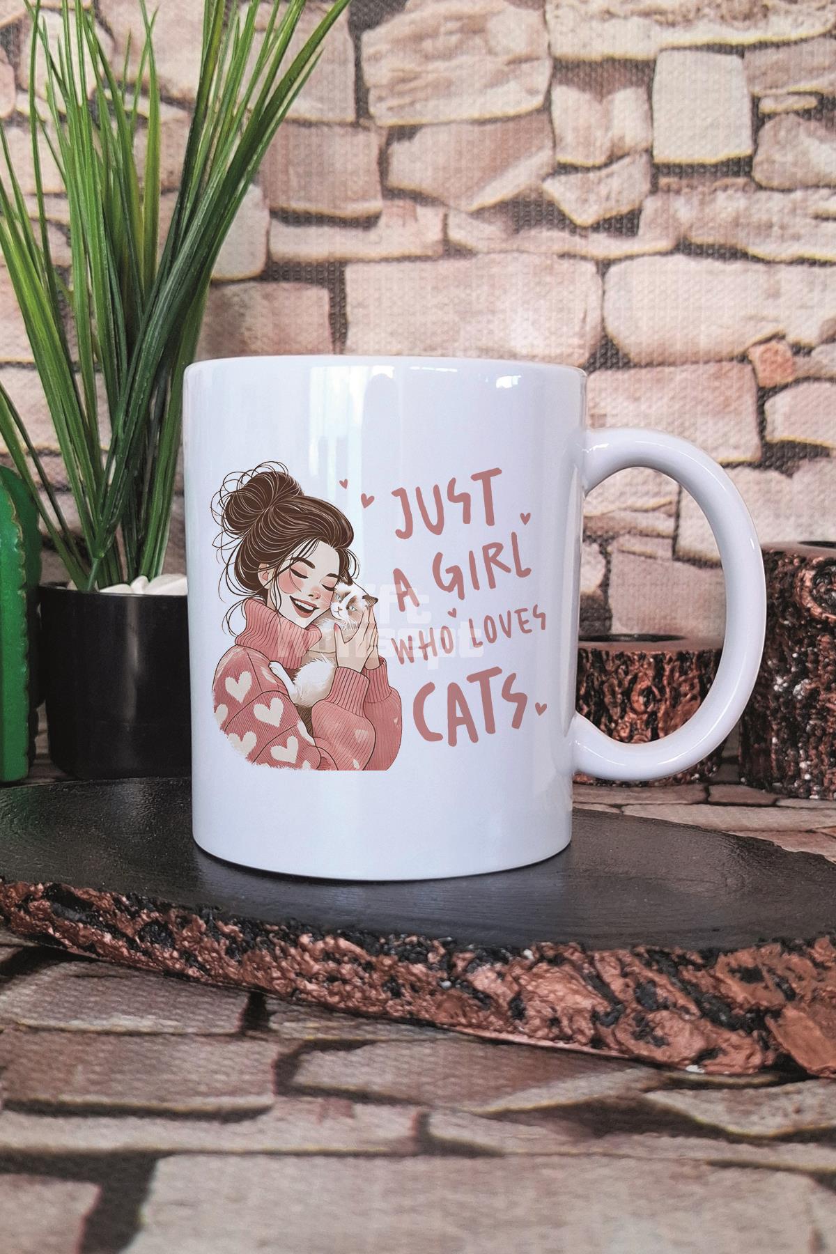 Just A Girl Who Loves Cats Temalı Kedi Aşığı Kız Hediyelik Baskılı Çay Kahve Sunum Kupa Bardak