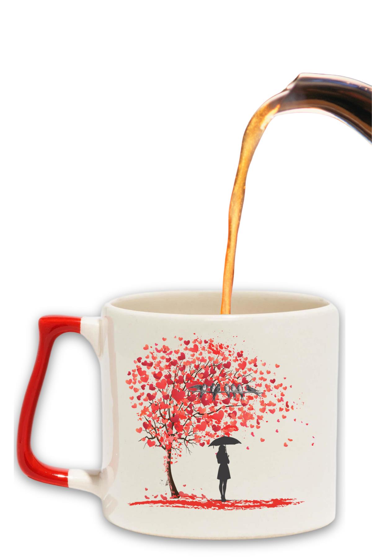 Kalp Yapraklı Hayat Ağacı ve Kuş Baskılı Romantik Hediyelik Renkli Kulplu Modern Seramik Kupa