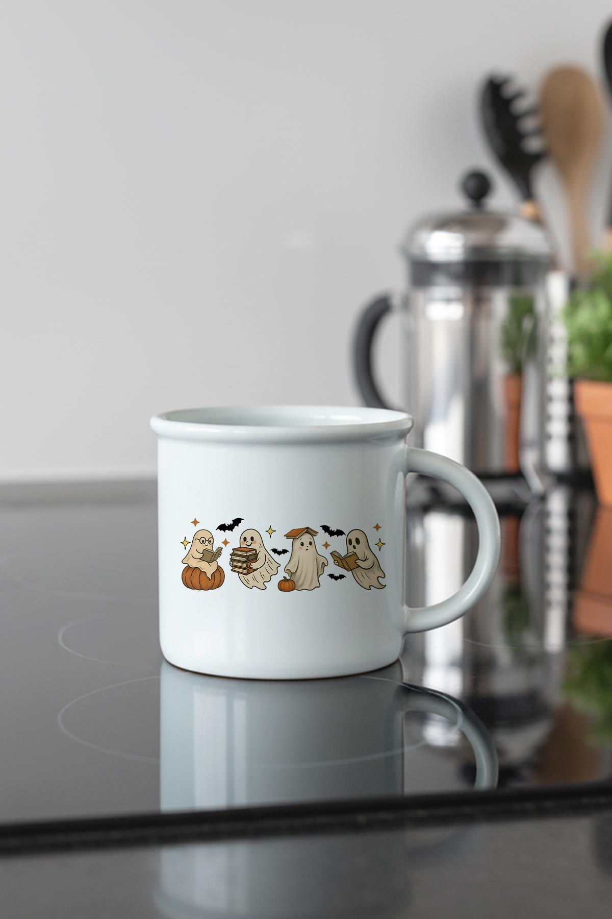 Kitap Okuyan Sevimli Hayaletler Baskılı Enamel Görünümlü Seramik Vintage Kupa Bardak