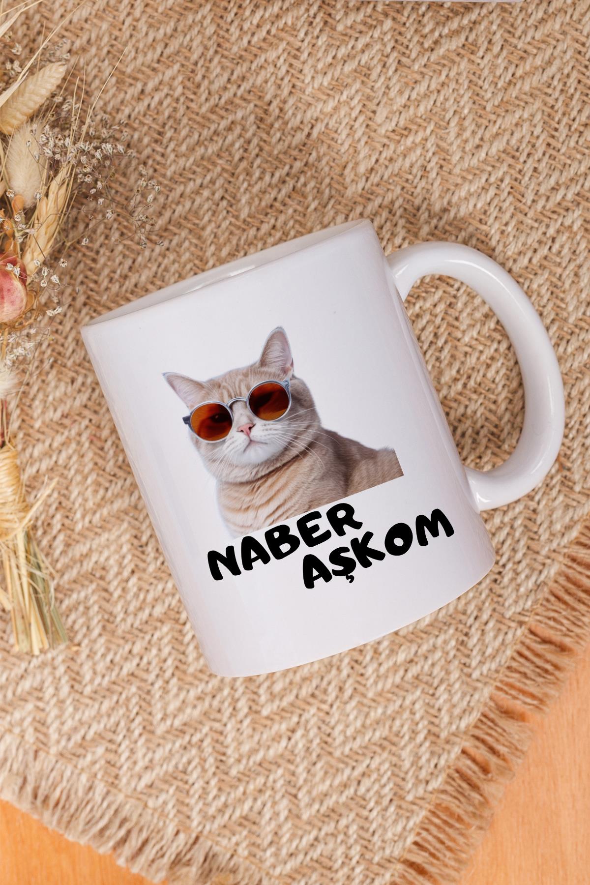 Naber Aşkom-Komik Kedi Baskılı Eğlenceli Hediyelik Beyaz Kupa Bardak