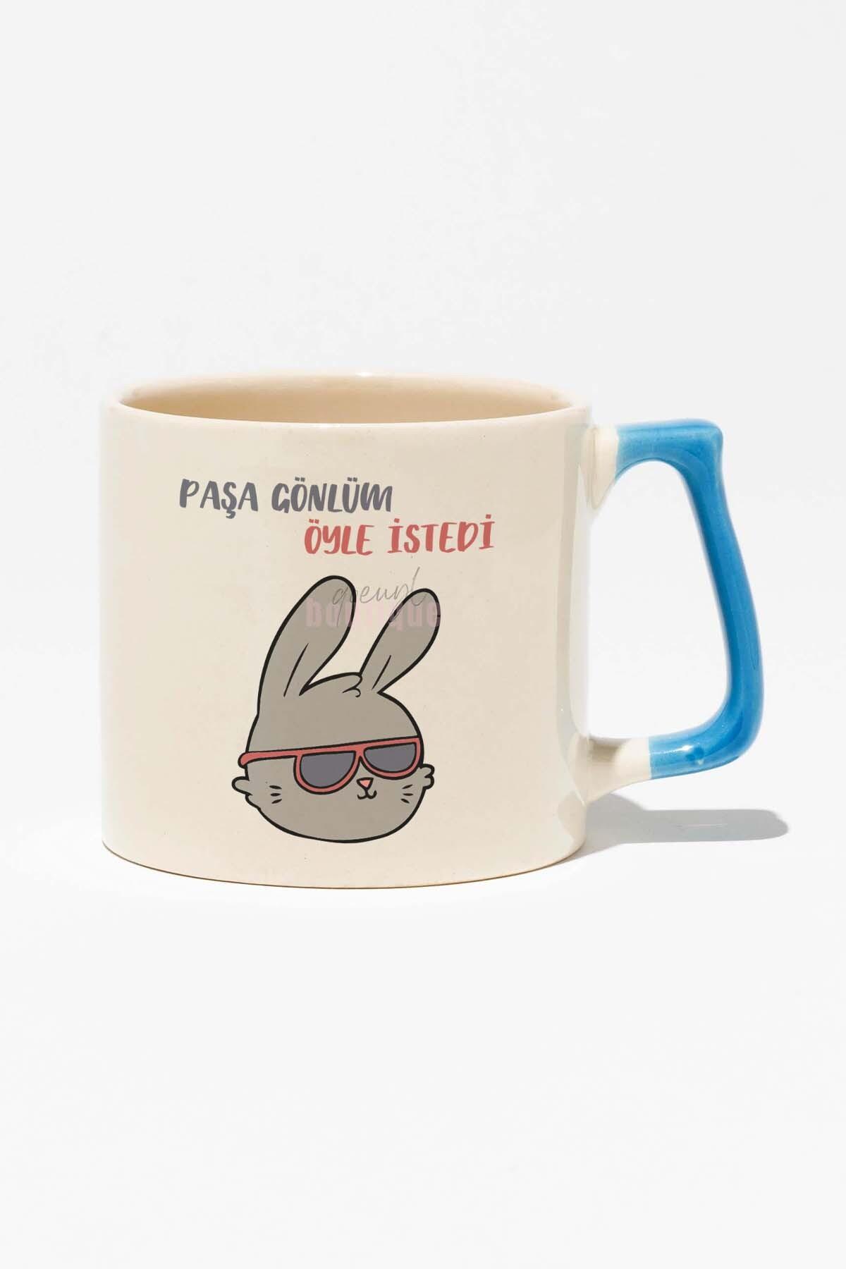 Paşa Gönlüm Öyle İstedi-5-Cool Tavşan Hediyelik Baskılı Mavi Kulplu Modern Seramik Kupa