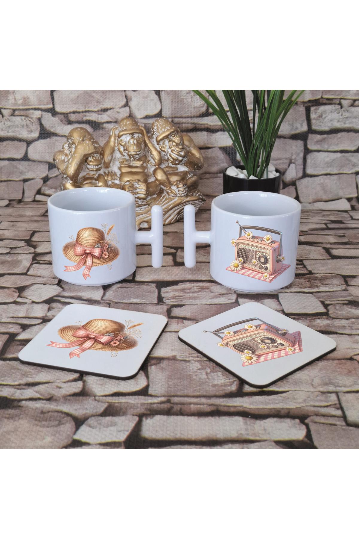 Şapka ve Radyo Bohem Baskılı 4'lü Set Ahşap Bardak Altlığı ve Latte Fincanı T Kulplu Kupa Bardak