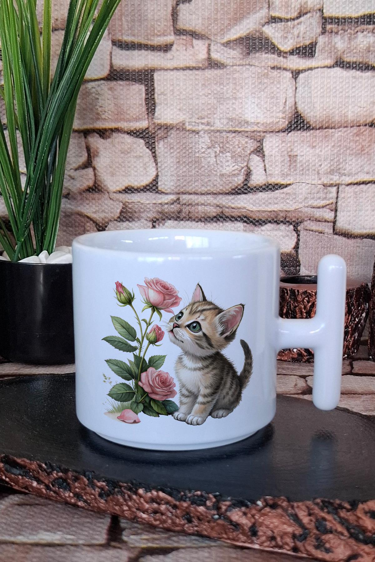 Sevimli Kedi Ve Çiçek Temalı Hediyelik Baskılı T Kulplu Latte Fincanı Kupa Bardak