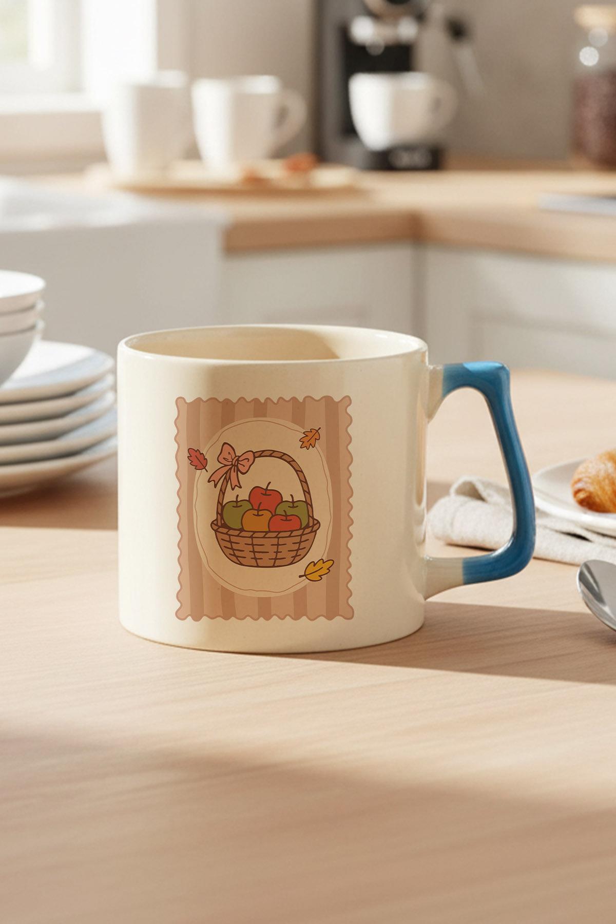 Sonbahar Temalı Elma Sepeti Baskılı Mavi D Kulplu Kupa Bardak