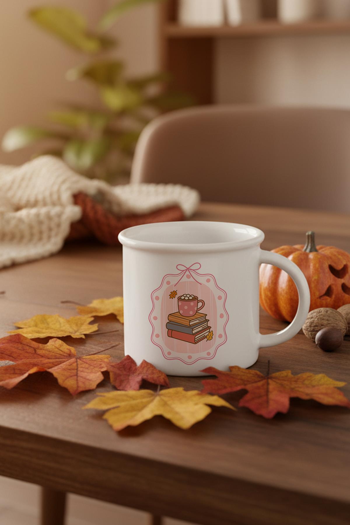 Sonbahar Temalı Kitaplar Ve Sıcak Çikolata Baskılı Enamel Görünümlü Seramik Vintage Kupa Bardak