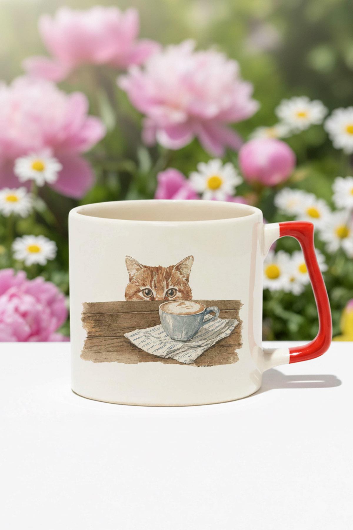 Sonbahar Temalı Sevimli Kedi No:1 Baskılı Kırmızı D Kulplu Kupa Bardak