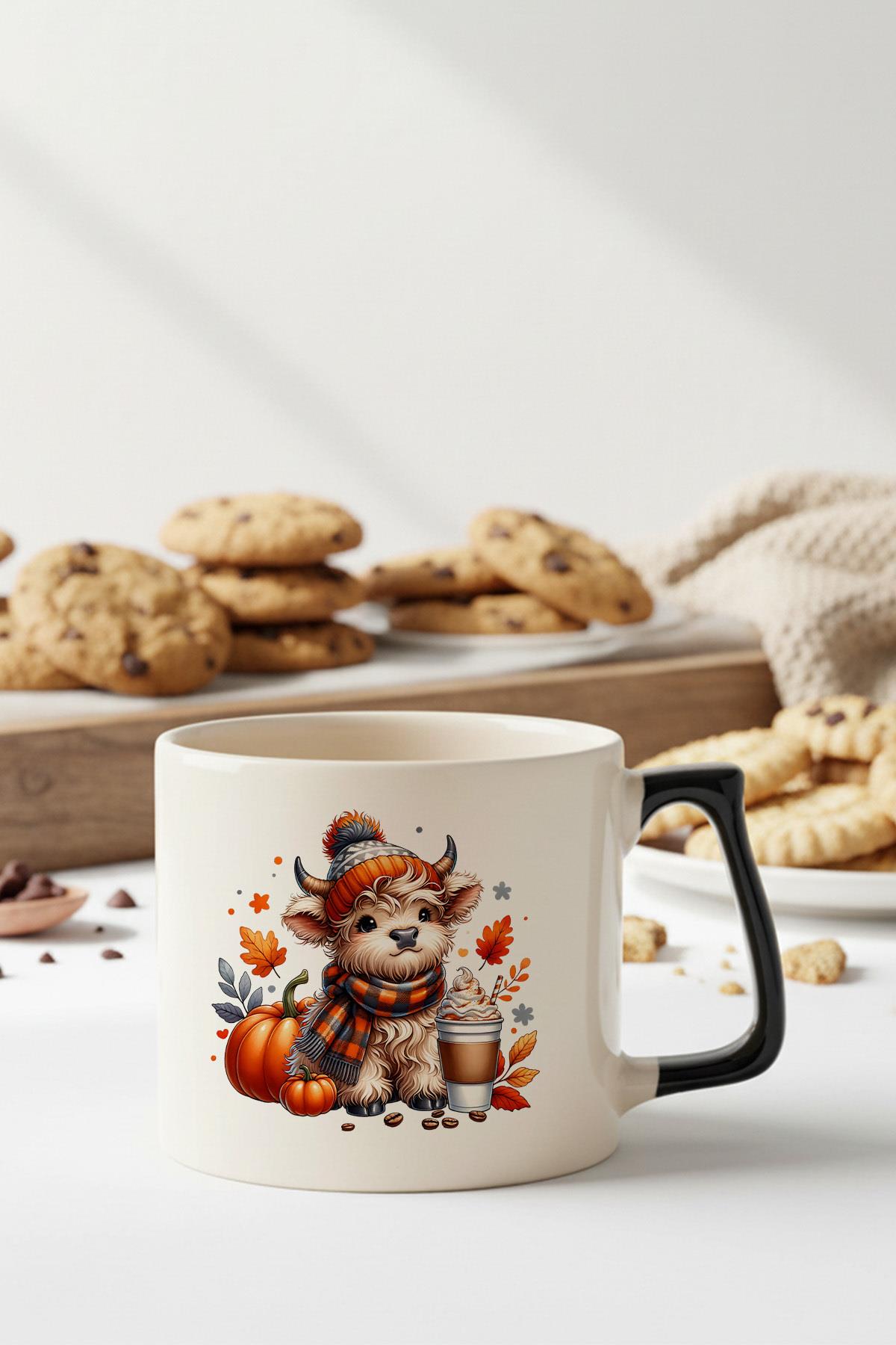 Sonbahar Teması Fall Vibes Highland Cow Baskılı Siyah D Kulplu Kupa Bardak