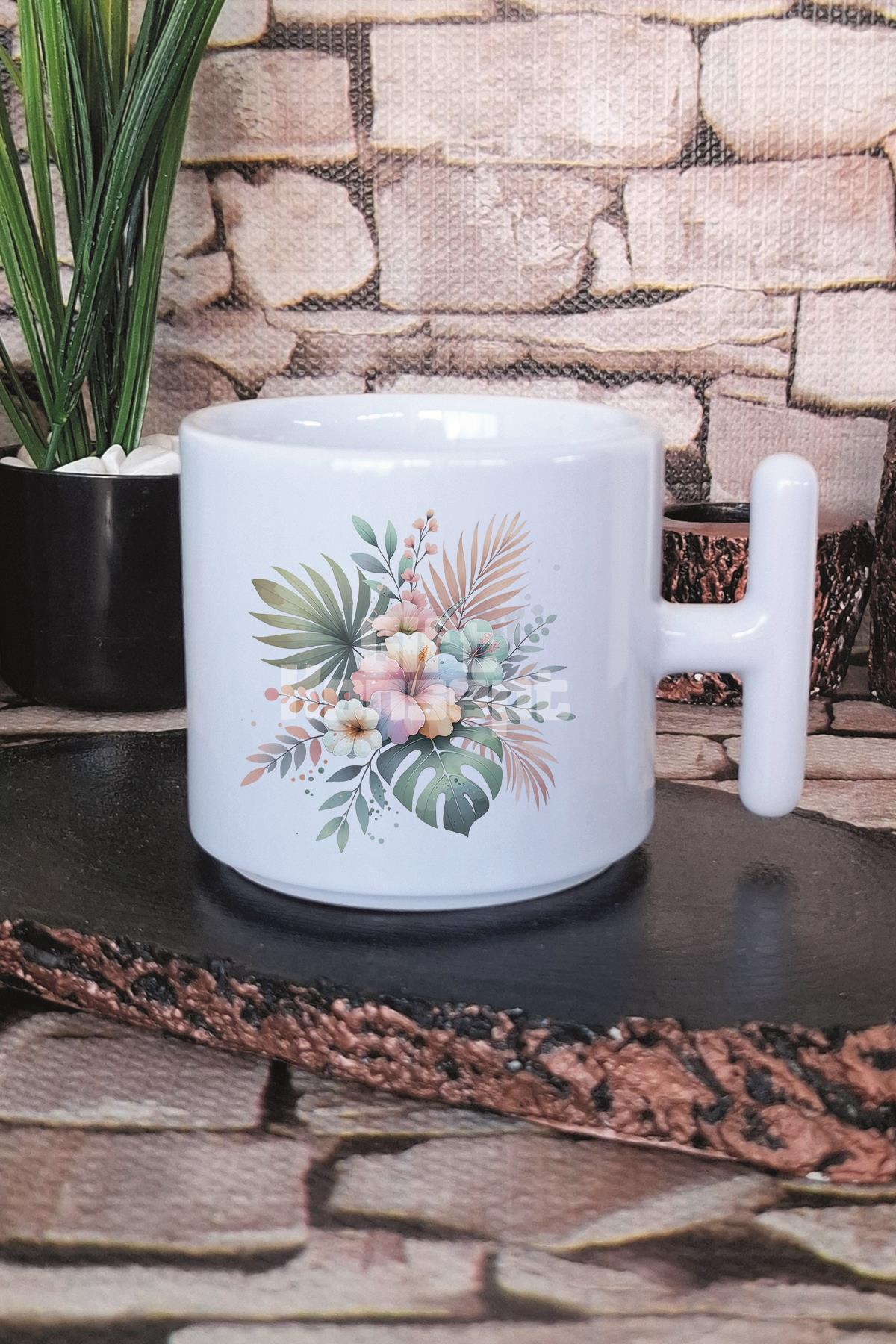 Tropikal Çiçekler Baskılı T Kulplu Latte Fincanı Kupa Bardak
