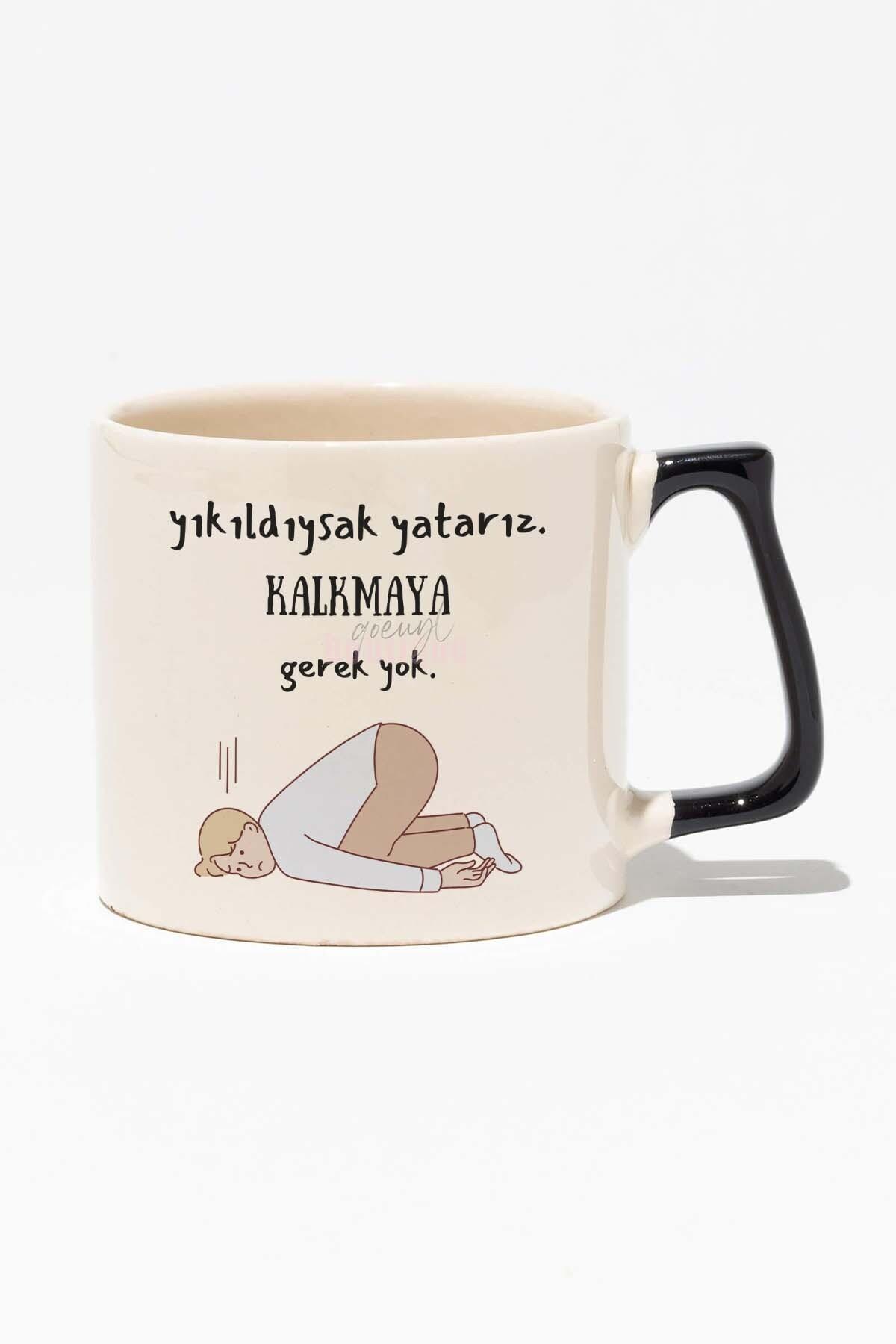 Yıkıldıysak Yatarız. Kalkmaya Gerek Yok Eğlenceli Beyaz Baskılı Siyah Kulplu Modern Seramik Kupa